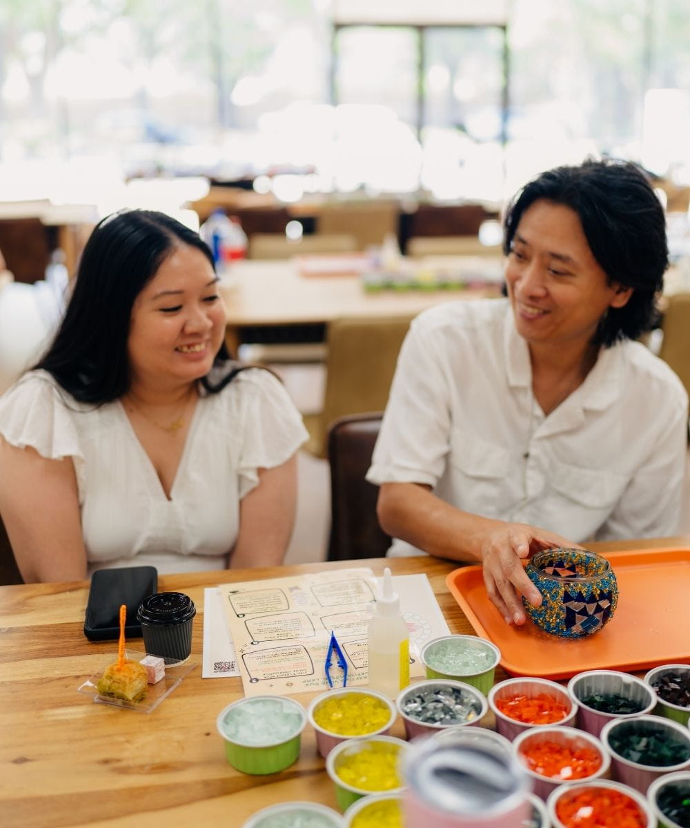Step into our Sugar Land studio and immerse yourself in a truly enchanting atmosphere. No prior experience is needed our expert team will guide you through every step of the mosaic lamp-making class.